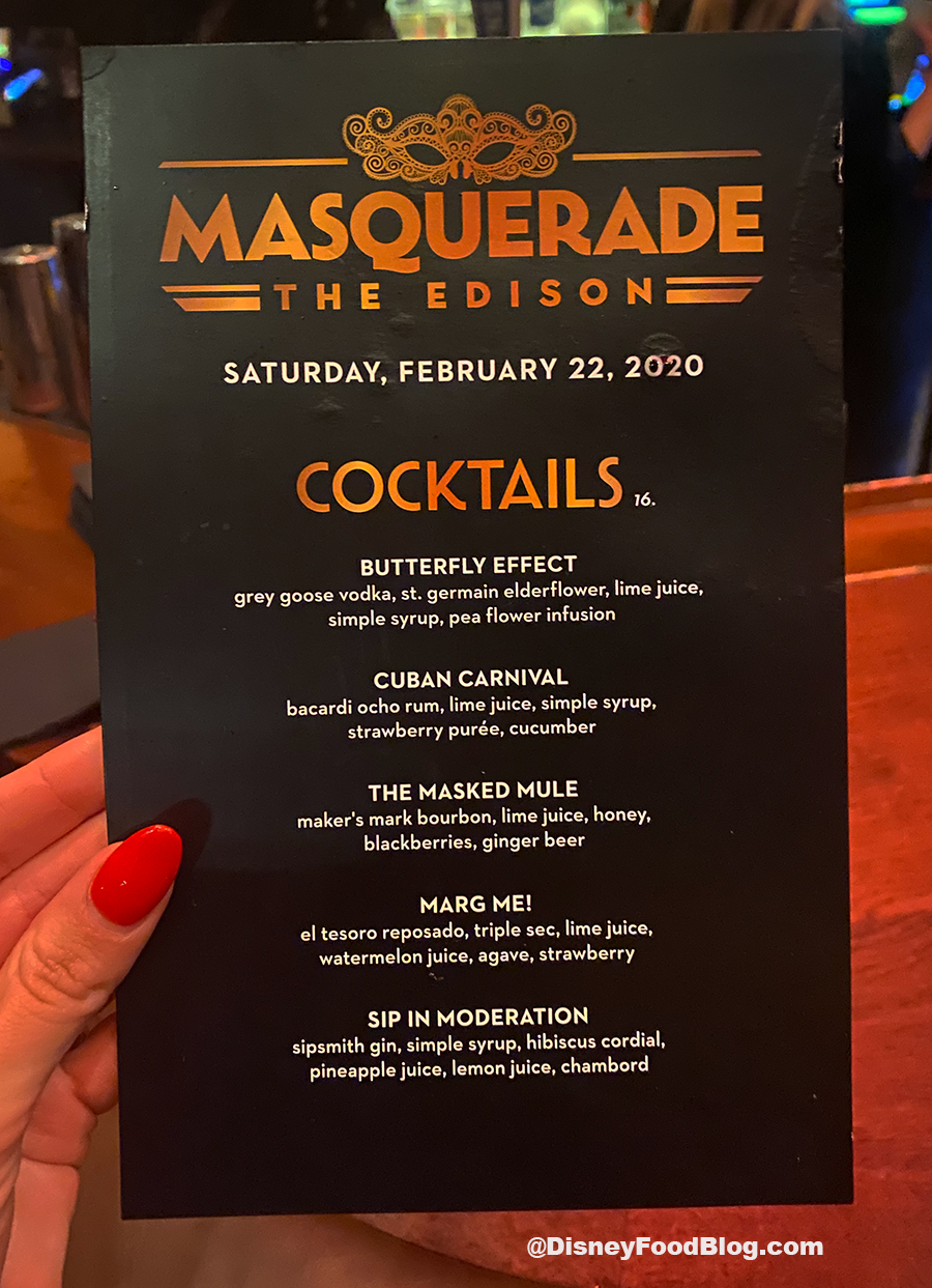 Disclosure: In nearly all circumstances, Disney Food Blog writers and photographers pay full price for their own travel, hotel, food, beverage, and event tickets. We do this because it’s important to us as journalists to ensure not only that we give you unbiased opinions, but also that you can trust us to do so since we’re paying our own way. On rare occasions, when we are invited by a company to attend a preview as media, and when we choose to accept that invitation, we will always make you, our readers, aware of that situation. Today, we were invited by Disney World to attend their media preview of The Edison’s Masquerade. Note that when we attend events as media we are 1) Not required to review that event/food on any of our channels, and 2) Not required to review that event/food favorably. You can always count on DFB to give you a 100% unbiased and honest review of any event that we attend, food that we eat, or beverage that we drink. You can see more in our Disclosure Policy. Thank you for reading. — AJ