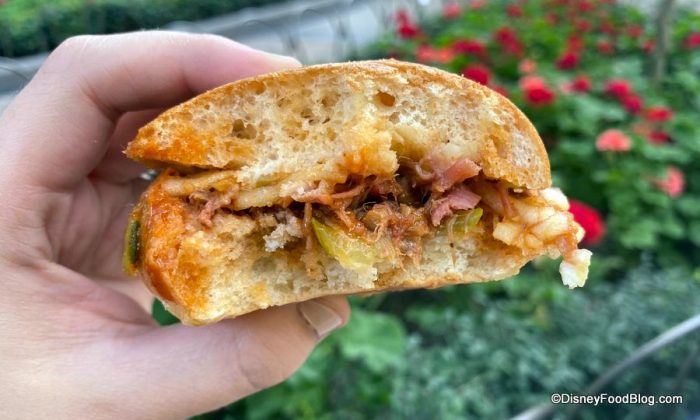 This is a nice, light festival option and we loved the beautiful white pieces of fish and crunchy slaw. We were hoping for some oomph from the infused batter, but sadly there wasn’t a whole lotta extra flavor going on here.