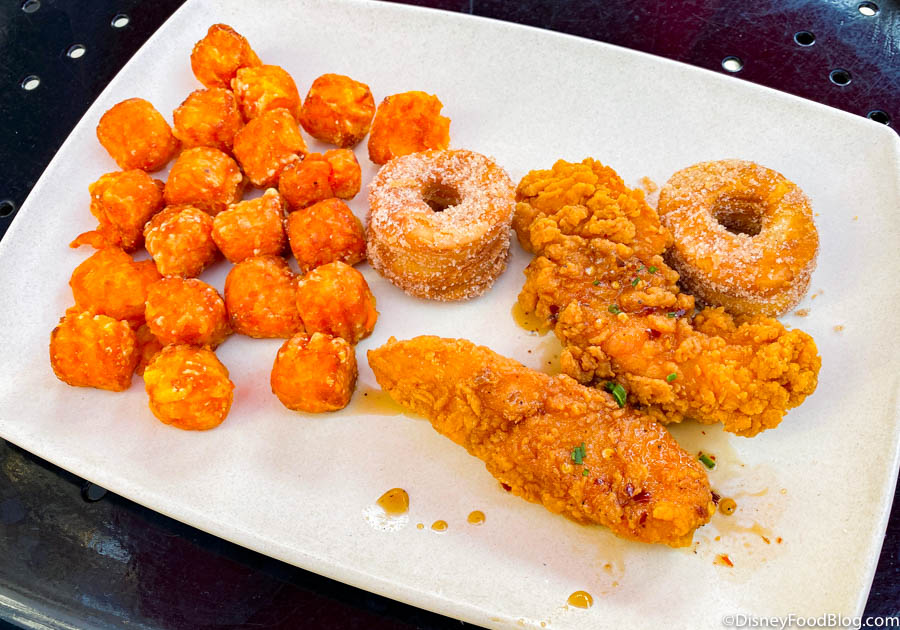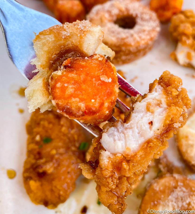The chicken tenders were crunchy, flavorful, and had a slight spiciness to them (and we would have even been game for more heat!). The kick of flavor from the savory chicken balances out the sweetness from the maple syrup, donut, and sweet potato.