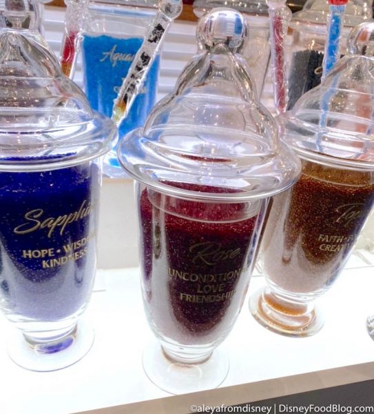 Then, you can add different crystals representing things like good luck or true love to fill the wand before it’s sealed with a topper! While you can choose a Mickey’s Sorcerer Hat (the obvious choice), there are also other themed crystal toppers available to make your wand perfect for your taste.