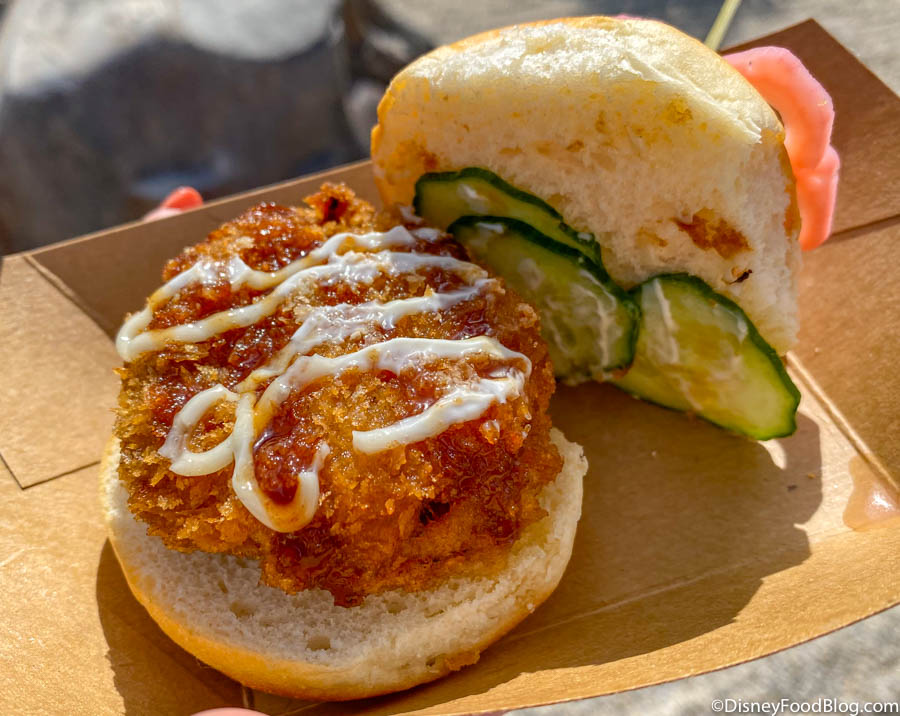 This slider was super yummy and filling! It tastes like a crispy deep-fried hamburger! The Tonkatsu sauce and mayo added a lot of flavor and we would have liked to see even more sauce on ours. The lotus and cucumber gave the burger a bit of freshness. We suggest slipping the pickled lotus inside the slider to make it easier to eat!