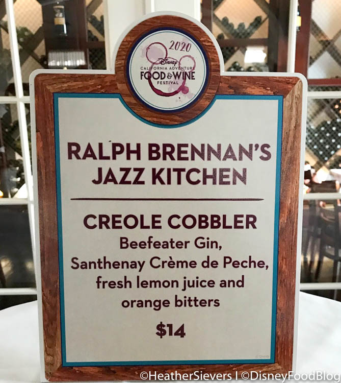 That’s where we met up with the Creole Cobbler! This Food and Wine Festival cocktail costs $14 and features Beefeater Gin, Santhenay Crème de Peche, Fresh Lemon Juice, and Orange Bitters.