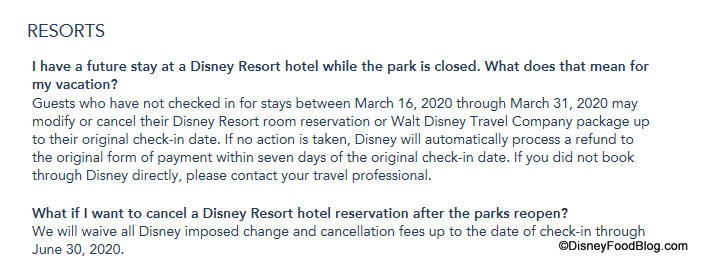 Guests who had booked a stay at a Walt Disney World Resort hotel for the originally affected dates (through the end of March) had the following options: “Guests who have not checked in for stays between March 16, 2020 through March 31, 2020 may modify or cancel their Disney Resort room reservation or Walt Disney World Travel Company package up to their original check-in date.”