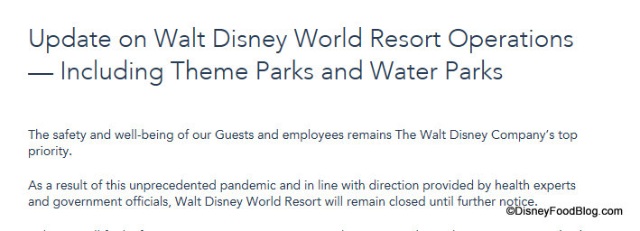 Originally, the closure was set to begin “at the close of business on Sunday, March 15th, through the end of the month,” March 31st, while Disney Resort hotels would remain open to guests through Friday, March 20th. EDITOR’S UPDATE on March 27th: Today, Disney has announced that Walt Disney World will be closed “until further notice.” Therefore, this post is updated to reflect cancellation and refund procedures in light of this extension of the closure.