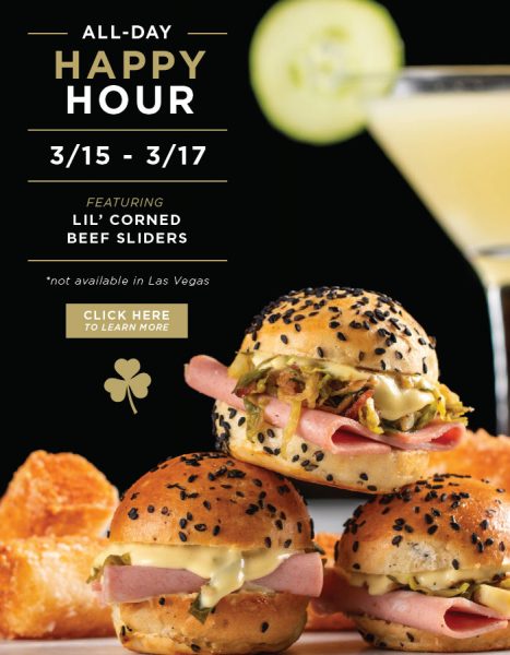 The Lil’ Corned Beef Sliders are highlighted as the festive option, but that’s not the only thing you can get on the Happy Hour menu!