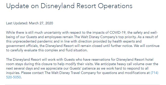 On March 27, 2020, Disney announced Disneyland would remain closed “until further notice.”