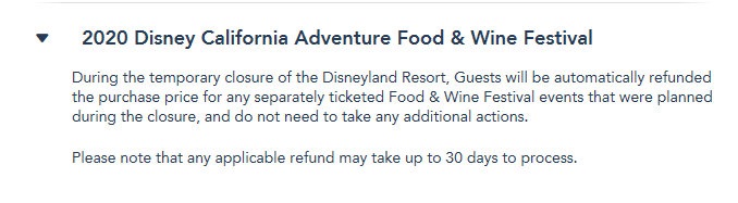 Please note that the Special Event ticket refunds also include Special Event tickets guests may have purchased for the Disney California Adventure Food and Wine Festival.