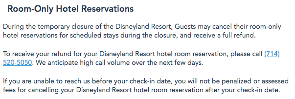 Guests can cancel room-only hotel reservations for stays scheduled during the closure dates for a full refund. In order to receive a refund, guests can call (714) 520-5050.