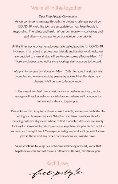 … Anthropologie and Free People have stated that their in-store employees will continue to be paid, despite the closures!