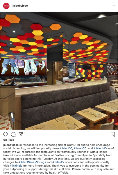 Jaleo is run by Chef José Andrés. Today, he announced on both his website and Instagram that all of his restaurants in the Washington D.C. area and New York City will be temporarily closing due to the coronavirus as of March 15th. For the time being, these restaurants will be repurposed as “community kitchens” with affordable take-out meals available for purchase.
