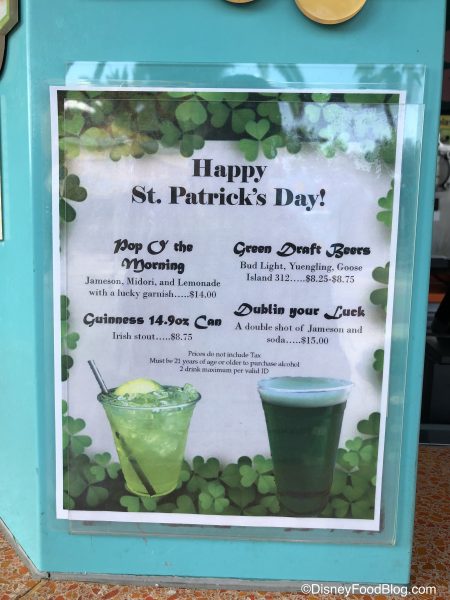A pool bar sounds like a great place to celebrate St. Patrick’s Day. We found this drink menu at Petals Pool Bar. Holiday options include standards like Guinness for $8.75 and Green Draft Beer. You can get Bud Light, Yuengling, or Goose Island 312 as a Green Beer, and the price varies from $8.25-$8.75. As far as cocktails, the Dublin Your Luck is a simple double shot of Jameson and soda for $15. For something a little more fruity, the Pop O’ the Morning has Jameson, Midori, and lemonade with a garnish. You can sip on this one for $14.