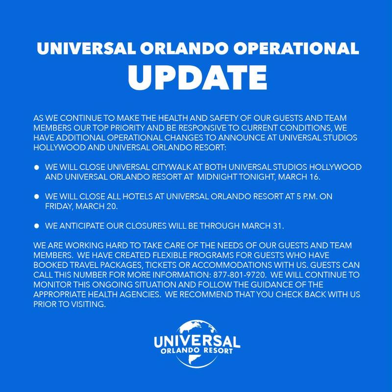 Now, Universal has also announced that they will be closing their hotels and Universal CityWalk as well.
