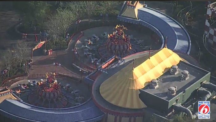 Fantasyland’s Dumbo the Flying Elephant appears frozen in time with all pachyderm flights grounded for now.