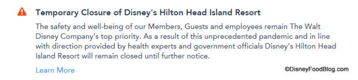 Disney has announced that Disney’s Hilton Head Island Resort in South Carolina will close at 5:00 PM on Friday, March 20th through the end of the month.