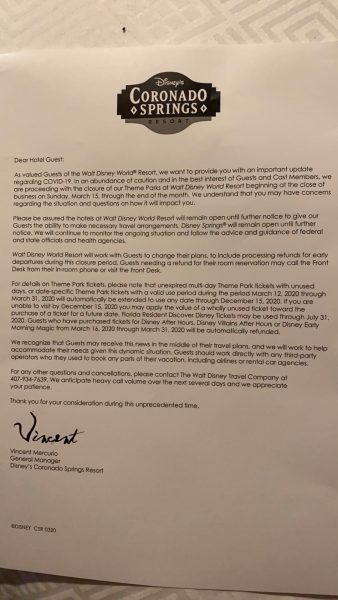 Along with the closure information released by Disney at the time, the letter instructed hotel guests they could use their in-room phones to call the front desk and work out how to modify or cancel their travel plans. While this type of large-scale closure had a huge impact on travel plans for guests, especially those mid-trip, the good news is that Disney has been very accomodating about refunds and adjustments to travel plans.