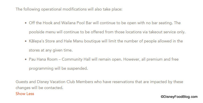 Modifcations are also being put into place for select locations which remain open. For instance, bar seating will no longer be available at Off the Hook and Wailana Pool Bar. Limits are also being placed on the number of guests allowed in resort merchandise locations. And premium and free programming will be suspended in the Pau Hana Room – Community Hall (the Hall itself remains open).