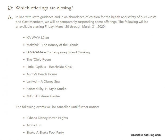 Additionally, ‘Ohana Disney Movie Nights, Aloha Fun, and the Shake-A-Shaka Pool Party are cancelled until further notice.