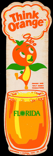 In 1970, the Florida Citrus Commission partnered with Disney World to sponsor the Sunshine Pavilion, comprised of Tropical Serenade (Enchanted Tiki Room) attraction and Sunshine Tree Terrace, in Disney’s Magic Kingdom. Orange Bird was created as the mascot and was featured in ads for Florida oranges. He could be found perched at the back of the Sunshine Tree Terrace counter-service stand, where guests could enjoy a glass of fresh Florida orange juice or, one of our favorites, the Citrus Swirl.