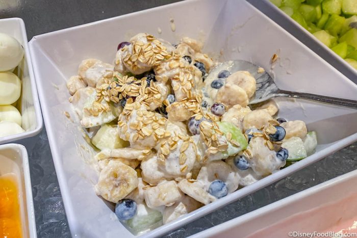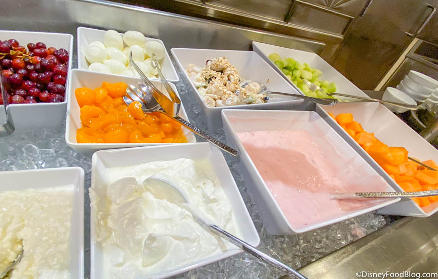 On the cold bar were fresh fruits, as well as cottage cheese, yogurt, hard-boiled eggs, and spreads for your breads.