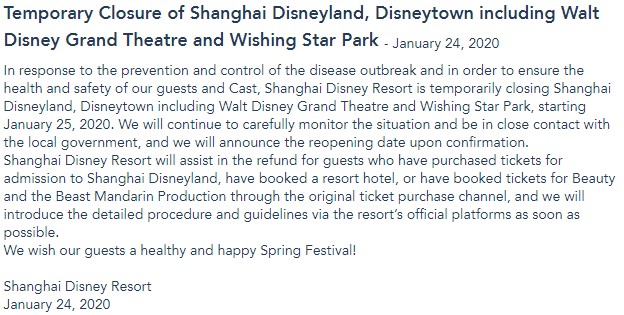 January 24, 2020 – Disney announced that it will be temporarily closing Shanghai Disneyland.