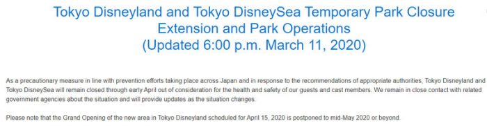 Remember, Japan originally announced that Tokyo Disney Resort would be closed for two weeks, similar to the announcement of the two domestic parks. Japan has since delayed the reopening by an additional two weeks at the very least.