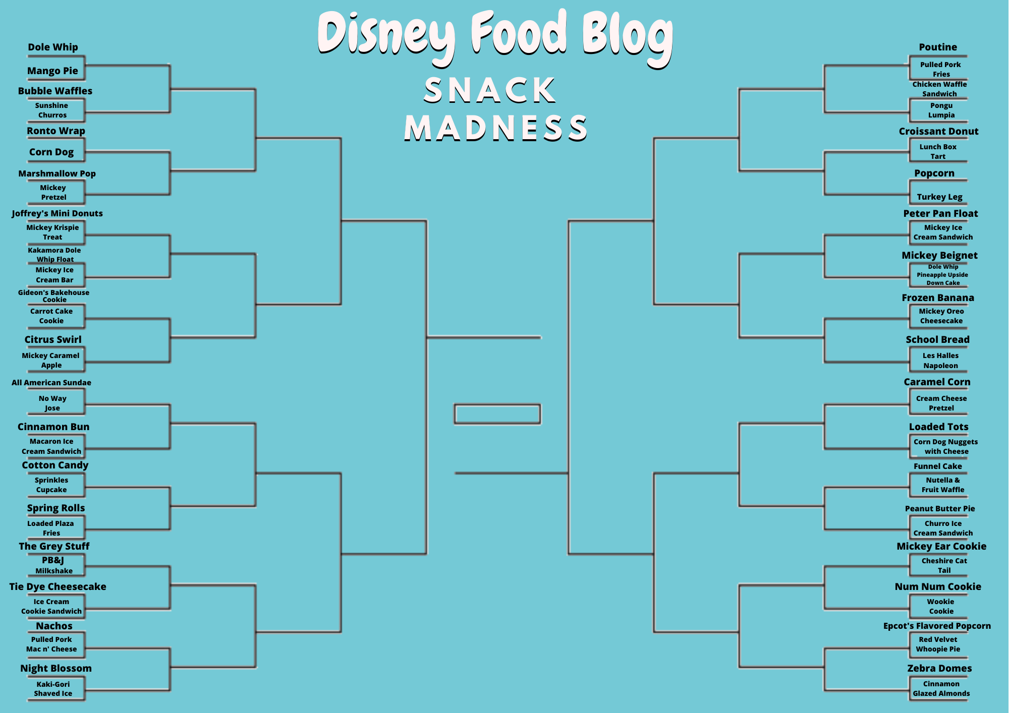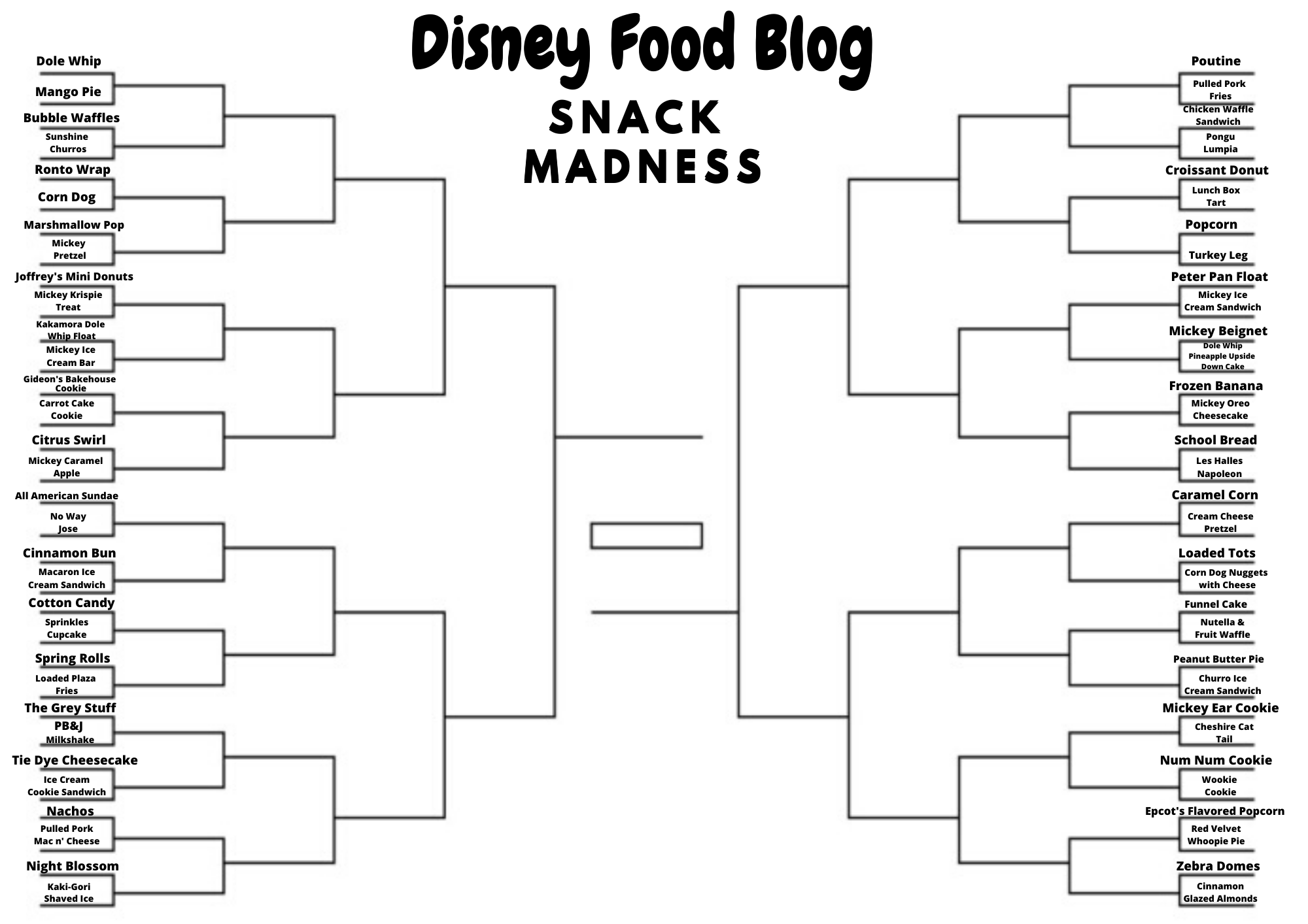 Anyways, it won’t take much for you and your hungry herd to play along with us! All you need is some paper and INK to print out your official DFB Snack Madness bracket BELOW! Just make sure you print one copy for each member in your family so everyone gets the pleasure of picking out their favorite Disney snack!