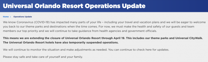 Universal Studios in Orlando and Hollywood have EXTENDED their closure and will now remain closed through April 19, 2020.