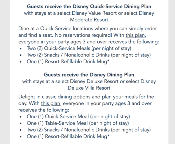 Your Dining Plan will be determined based off of which level of Resort you stay in. Guests staying at select Disney Value Resorts or Moderate Resorts will receive the Disney Quick-Service Dining Plan. Guests staying at select Disney Deluxe Resorts or Disney Deluxe Villa Resorts will receive the standard Disney Dining Plan.