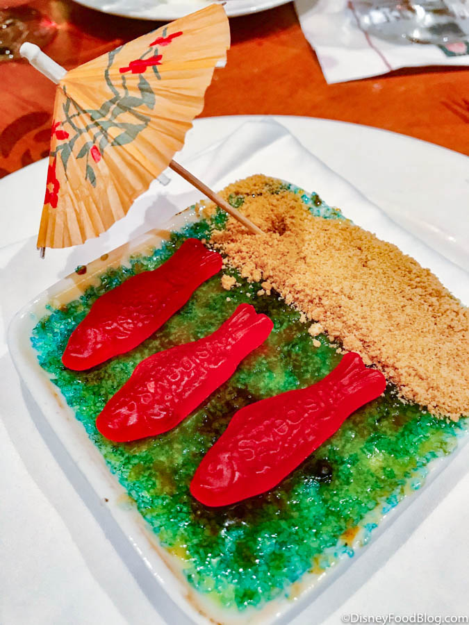 Are you guys ready for this super fun dessert?? We ordered the Balboa “Beach Sand” which is listed on the Kids’ Dessert menu for $6.50. It’s a Tahitian vanilla bean crème brûlée “ocean” with graham cracker “sand” and (wait for it…) Swedish fish! It even comes complete with an umbrella!