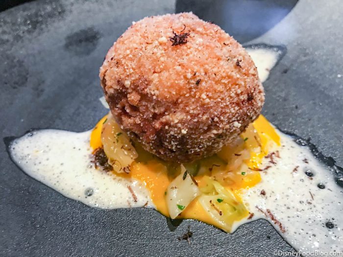 The prep for this one sounded intense but was worth the wait! They started by freezing chicken sauce stock into two half-cylinders to make a perfect ball shape. Then, chicken sausage was wrapped around the ball and breaded with rice flour. Next, the whole thing was deep-fried, so the sauce turned molten. When we cut into it, the sauce ran out, kind of like an egg! The final product was served on top of a truffle mousse!