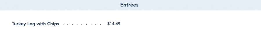 We also noticed the classic turkey leg is now listed as Turkey leg with chips, with a price increase of $2.00 from $12.49 to $14.49.