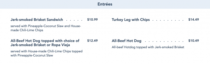 Speaking of hot dogs and turkey legs, both of those items saw some changes! The Hot Dog with Chili and House-made Chili-Lime Chips has disappeared and has been replaced with a Hot Dog topped with jerk smoked brisket. This menu item also saw a price bump by $1.00, from $9.49 to now $10.49. You can still get your chili lime chips, however, with an all-beef hot dog topped with your choice of jerk-smoked brisket or ropa vieja for a total of $12.49.
