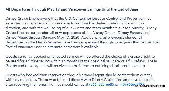 Also note that Disney Cruise Line is offering guests whose sailings were impacted “the choice of a 125% future cruise credit to be used for a future sailing within 15 months of their original sail date, or a full refund.”
