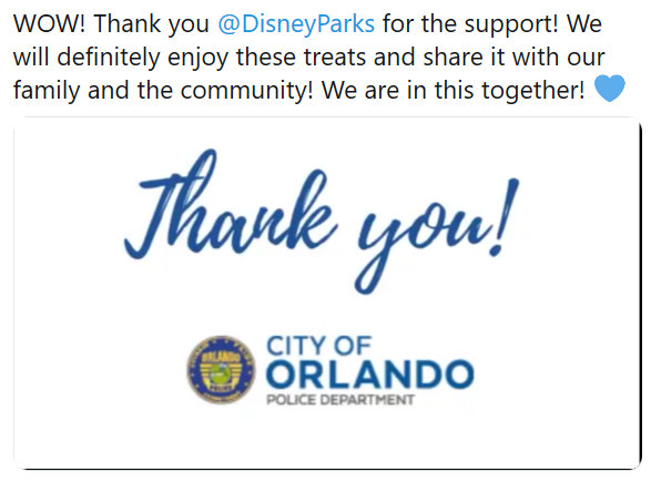 The department expressed “Disney, on behalf of the Orlando Police Department, thank you for this generous gesture.”