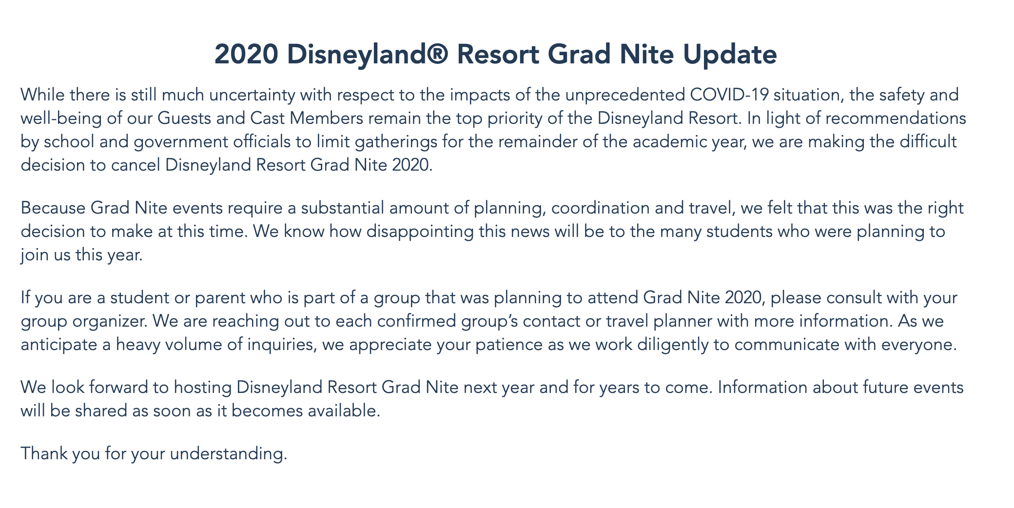 The official statement to cancel Grad Nite was released on Disneyland’s website this afternoon which you can read below.