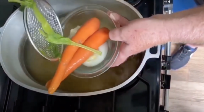 3. Let the vegetables steep in the broth, then scoop them out and set them aside.