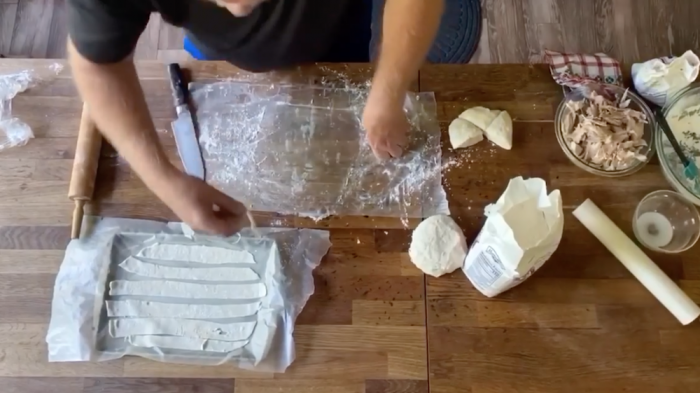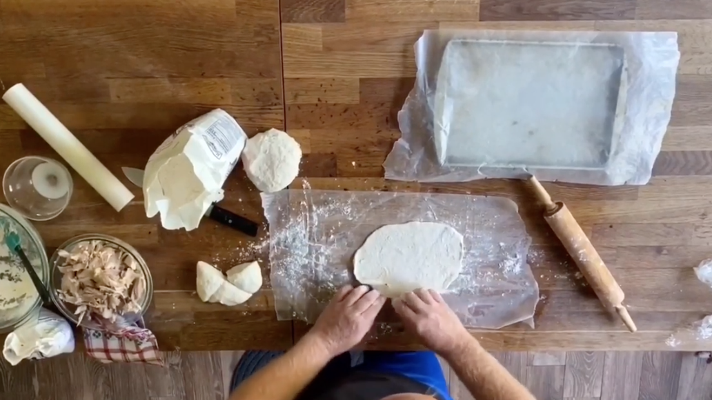 7. Cut the dough ball into four pieces. With a rolling pin, roll out the dough with flour until 1/4 inch thick.