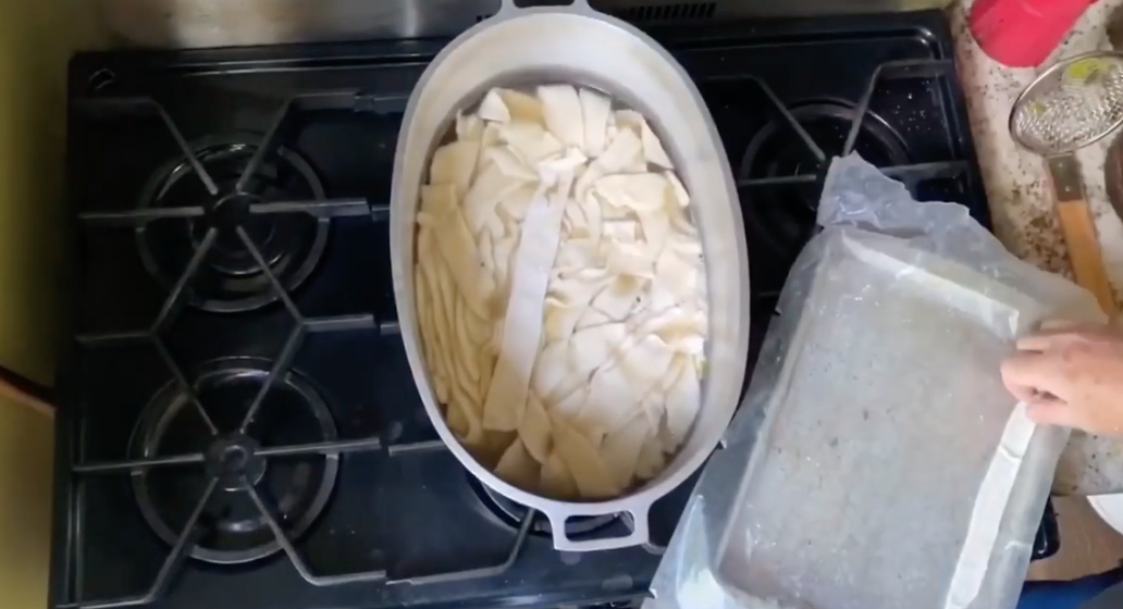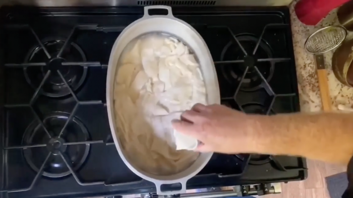 9. Place the dumpling dough strips in the boiling broth. Layer them on top of one another over the entirety of the broth. Shake oven, do not stir.