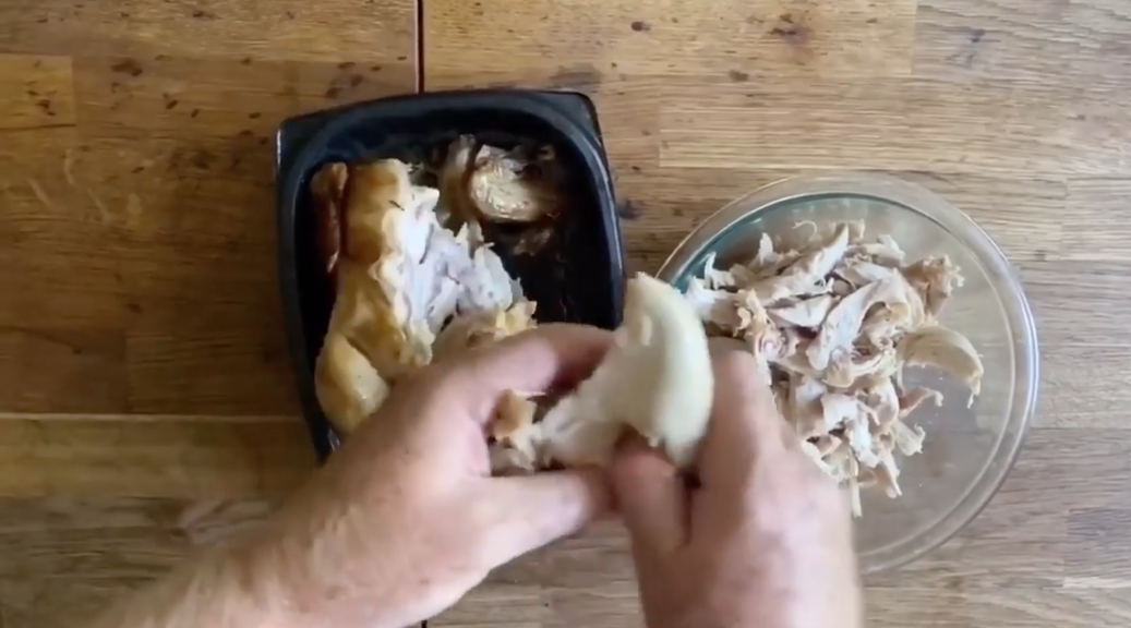 1. Cook a rotisserie chicken from the market or buy a pre-cooked rotisserie chicken. Remove from the bone and shred.