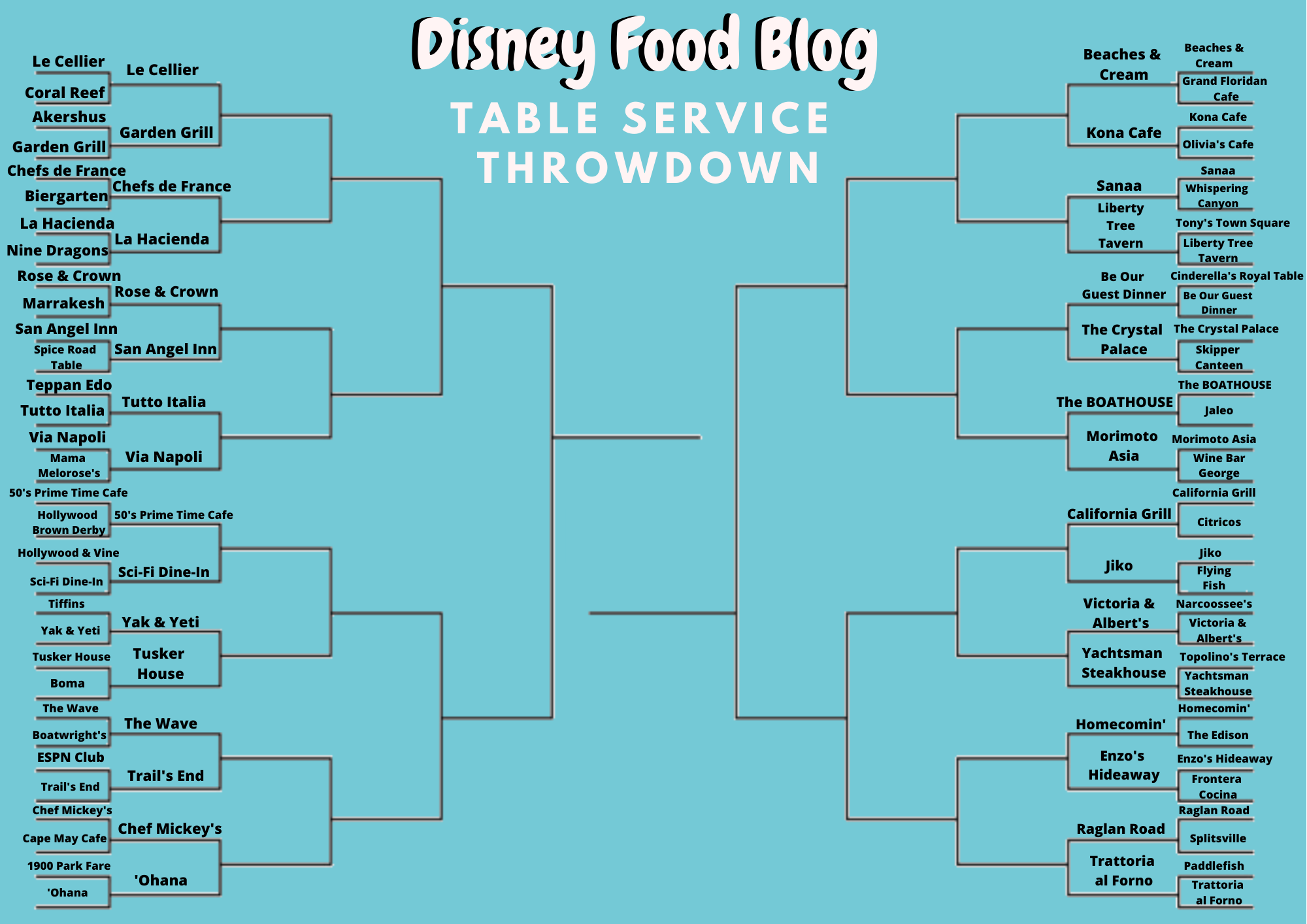I realize it is tough to set this up and nothing is perfect, but two venues at the same resort should not have faced off in the opening round. Narcoosee’s and Victoria & Alberts is the only case of this occurring and should have been avoided. I’m glad to see that some of the very best restaurants lost in the first round so that they won’t receive new exposure and crowds in the future! Citricos and Wine Bar George are consistently two of the best dining experiences on property..