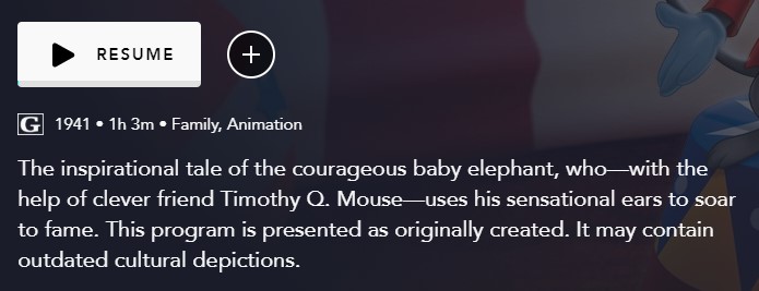 When you pull up either of these flicks — or any others that have questionable cultural representations, such as with the crows in Dumbo — you’ll find a disclaimer: “This program is presented as originally created. It may contain outdated cultural depictions.”