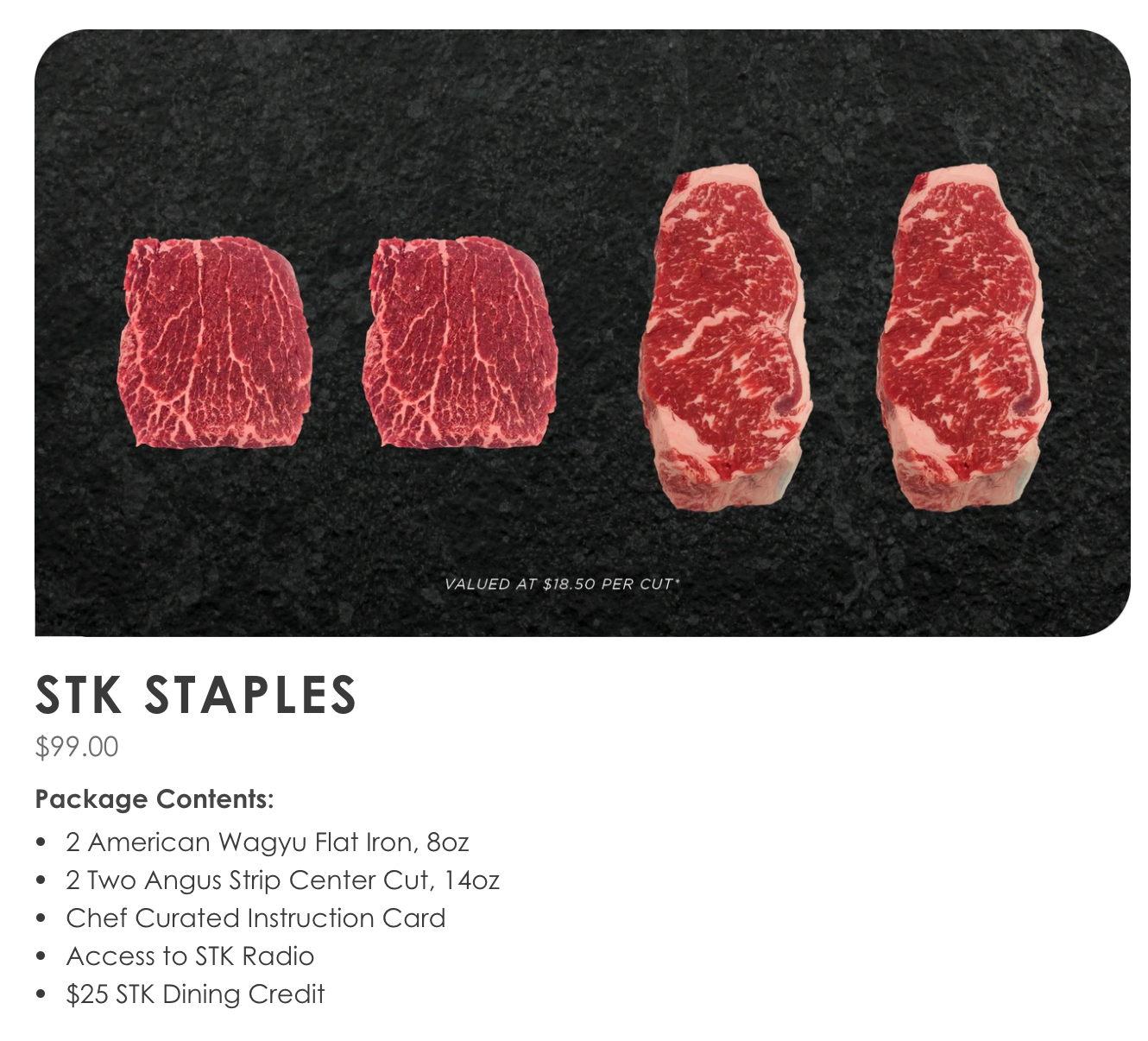 There are several premium STK meat packages to choose from offering various options such as center-cut filets, prime bone-in strip, angus strip steak, and even ground waygu beef! No matter which meaty assortment you choose, your order will come with a chef-curated instruction card so you’ll know how to best prepare them. Click here to check out all the packages and prices!