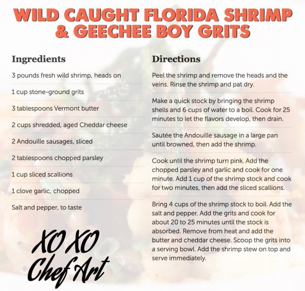 But that’s not all! Make sure you stay glued to that Instagram live stream, because Chef ArtSmith will also be mixing up his Wild Caught Florida Shrimp & Geechee Boy Grits from his Atlanta-based restaurant Southern Art and Bourbon Bar! If you can’t source fresh wild head-on shrimp, Chef Art says it’s cool to use whatever shrimp is handy! 😉