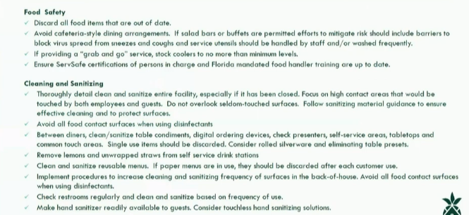 Keri Burns from the Florida Restaurant, Hotel, and Lodging Association presented lengthy recommendations for restaurants to the Bringing Back Tourism Work Group. Many of these recommendations have been discussed in prior task force meetings. You can read about a few of the reopening guidelines for restaurants here.