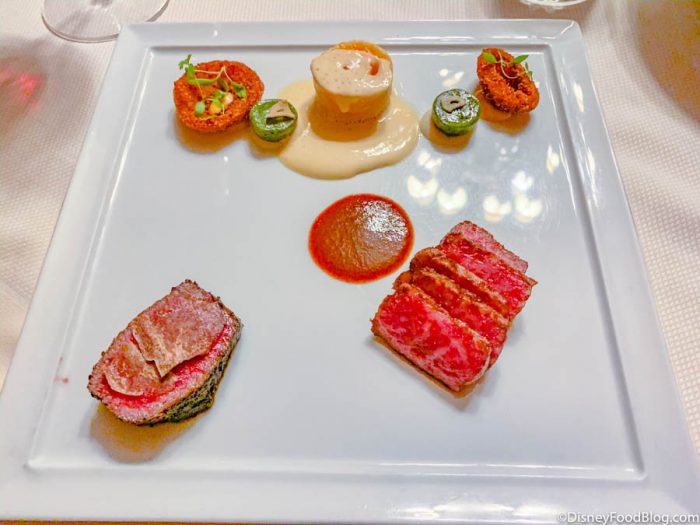 The third course brought along more seafood – and we weren’t complaining! It was Glacier 51 Toothfish and Nantucket Scallops with Dill and Potato Glass. Glacier 51 Toothfish is found 2,000 meters below sea level in the sub-Antarctic. So, it’s kind of a big deal. 😉 We tipped our hat to the brave fishermen and women who helped get this delicacy to our table and dug in!