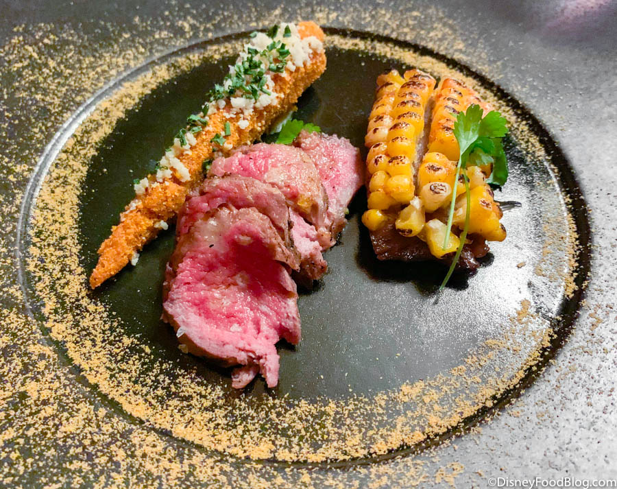 The boar tasted more like beef than pork to us — it was robust and tender. The meat (and the whole plate) was dusted in a chipotle spice that added an extra kick. The elote, aka seasoned corn, was served two ways: grilled corn on the cobb and a baby corn covered in spices and cheese.