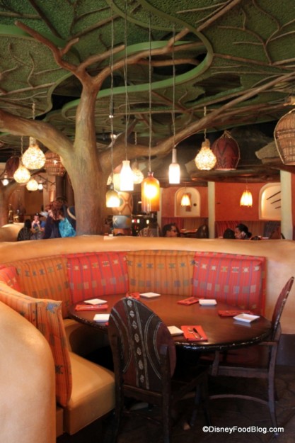 And entering the restaurant is an experience in itself! You’ll feel like you’re stepping outside into the Savannah, with pillars shaped like acacia trees. Hanging from these trees are lamps made to look like African Weaver bird nests. It takes dining with the animals to a whole new level!