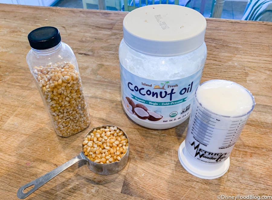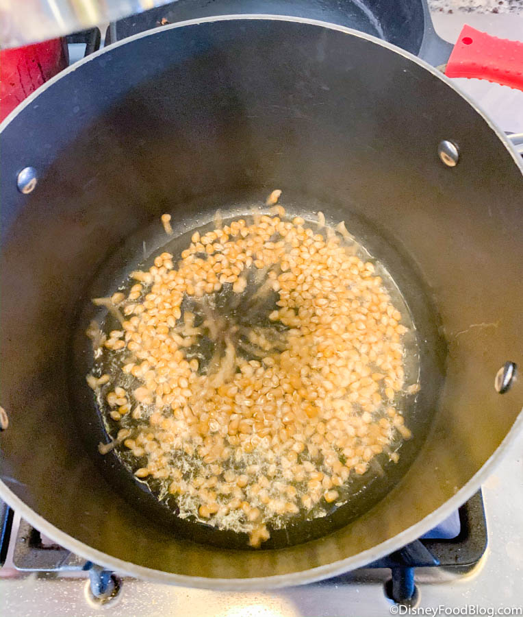 2. Once melted, add 3 kernels of popcorn to the pot. Wait for them to all pop! After they do, scoop them out and dump the rest of your kernels inside the pot.