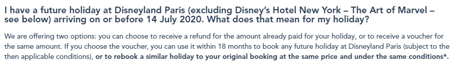 We spotted that the statement on the Disneyland Paris website had been amended today. Now, reservations arriving on or before July 14th are eligible for the cancellation offer — receive a refund or a voucher for the same amount. The voucher can be used within 18 months to book a future trip to Disneyland Paris.