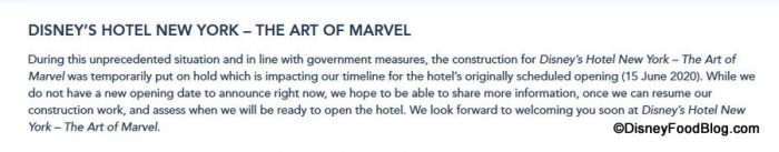 Information is provided both for guests who have a stay at the new hotel between June 15 and October 31, 2020 and also starting November 1, 2020 and beyond. For those in the initial booking window (June 15 through October 31), refunds or vouchers for a future visit “or to rebook a similar holiday to your original booking at the same price and under the same conditions Disney’s Hotel New York – The Art of Marvel once the date of opening is known.”